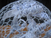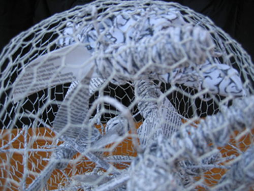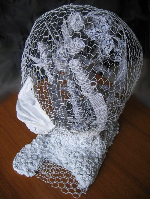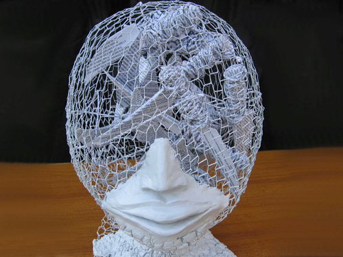An empty head made of wire netting and containing knives made up of layers of paper sheets where some scattered sacred texts of the world's main religions are printed.