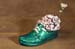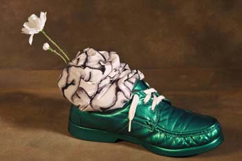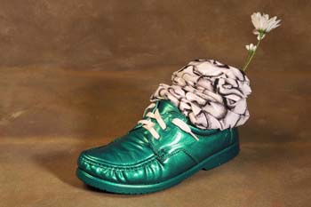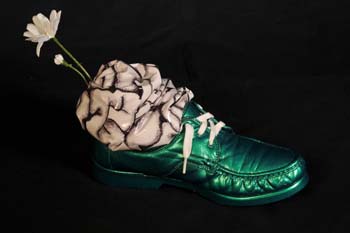 Scultura in cemento, scarpa, foglio di plastica stampato, fiore finto, vernice.