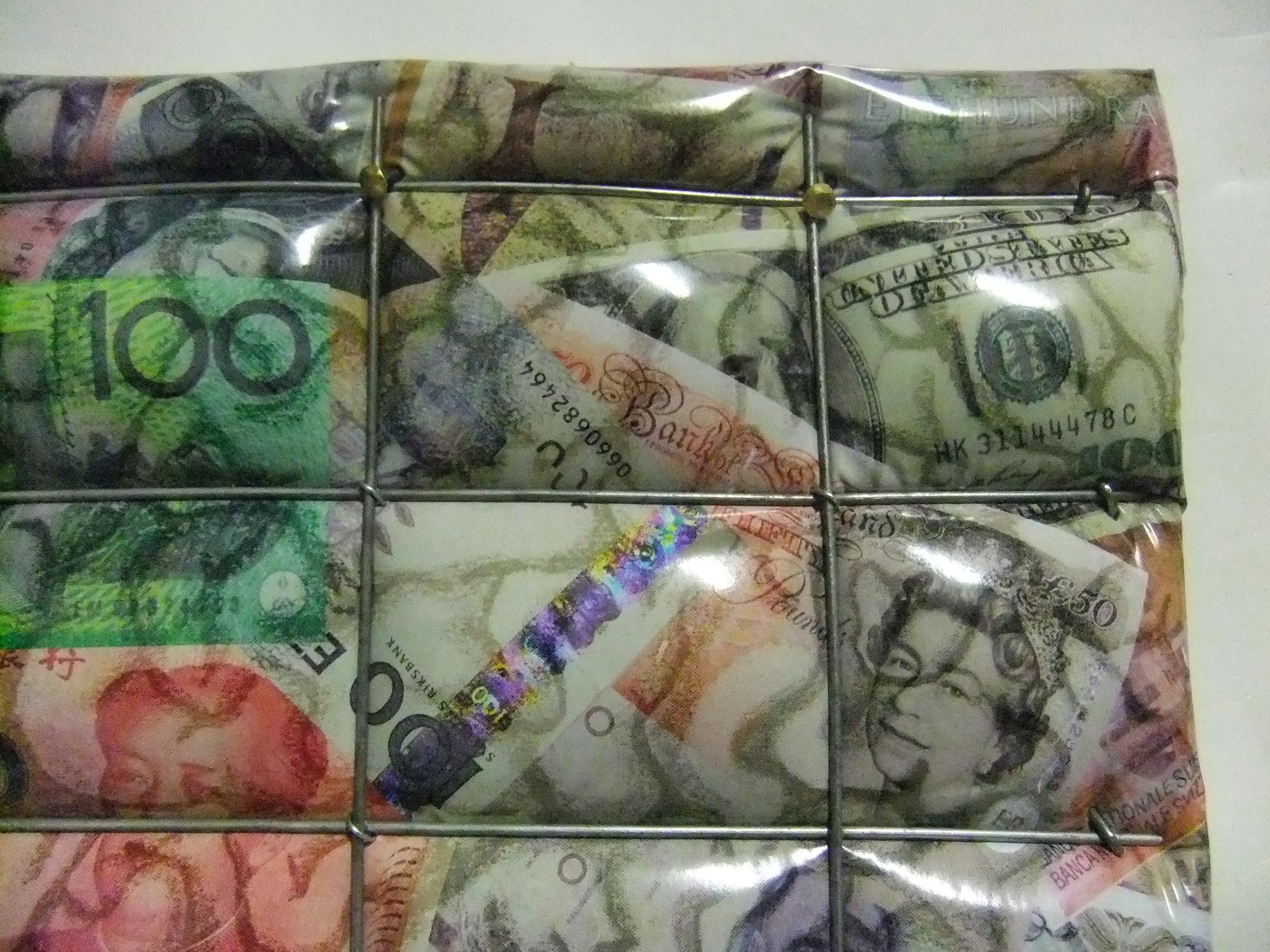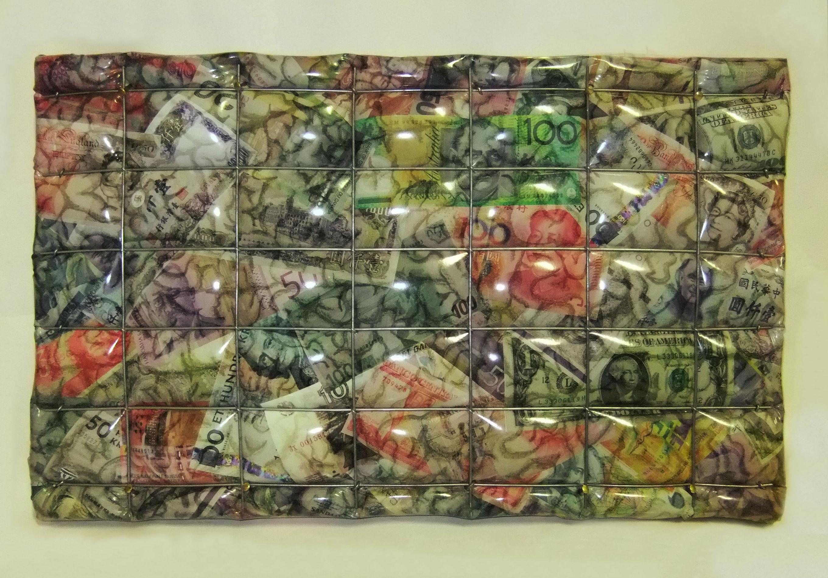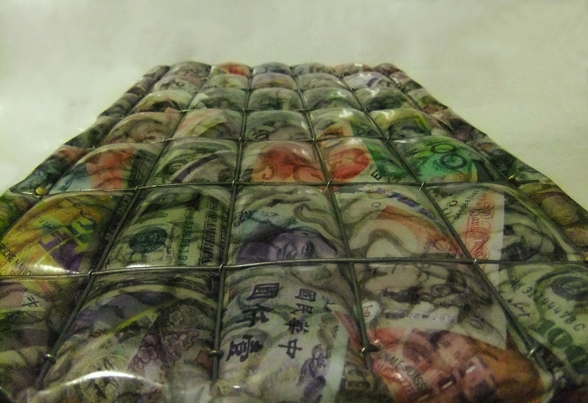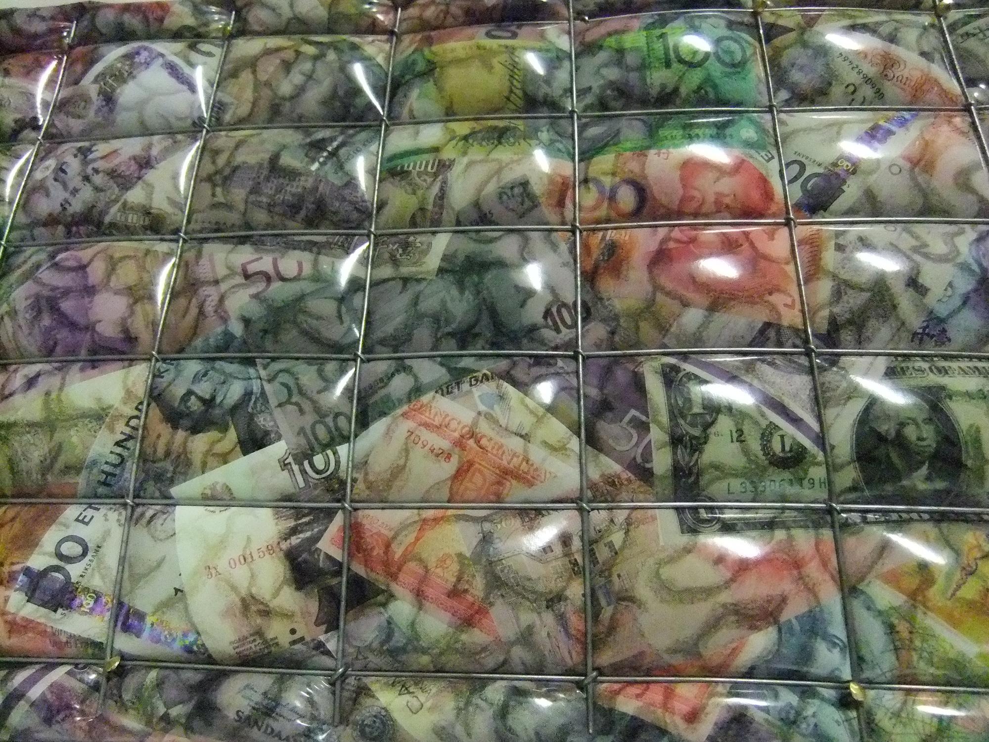 In my work “Finance Prison” the drawing of a brain is printed with the image of a lot of international banknotes to symbolize our money obsession.