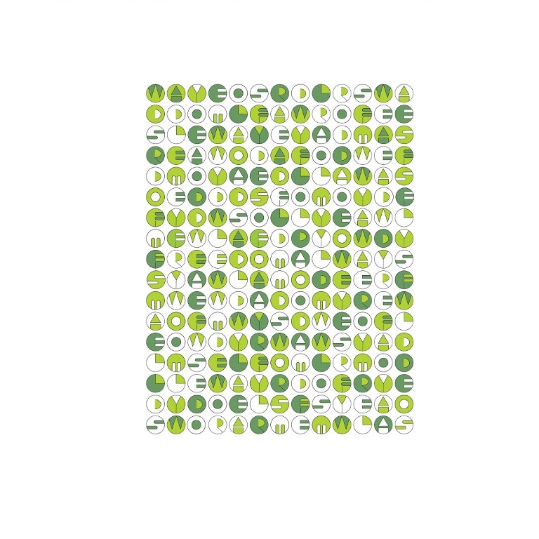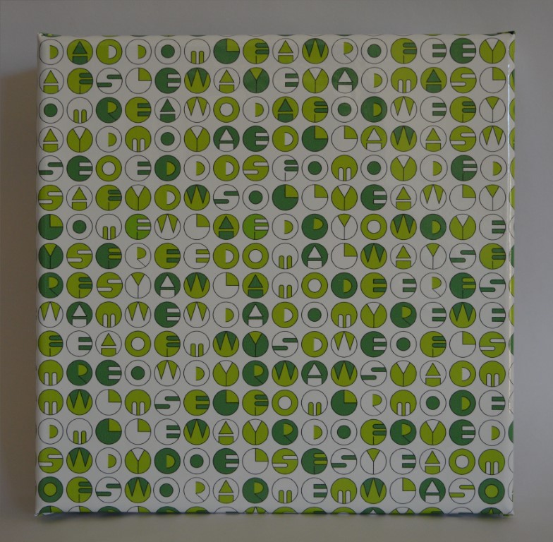 This work belongs to the series “talking Polka Dots” From 2019 the artist wants to launch messages in another form and creates his own personalized alphabet, using graphic thecnique. Each letter is inserted in a circle and colored, creating a particular chromatic effect. These little spheres are her “talking dots”. Polka dots are used to write very short senteces. One version (as in this case), provides a real tresure hunt as the sentence is in the center of the work, the first line reads from left to right and the following from right to left. Above and below are the letters that make up the sentence, inserted in random order creating confusion. A few words to start deeper considerations.