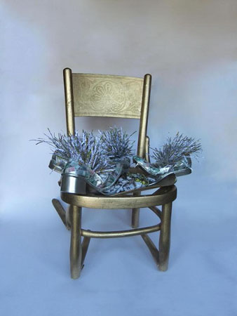 L’opera è costituita da una vecchia seggiola malandata alla quale ho anche spezzato le gambe riducendola “in ginocchio”. L’ho verniciata d’oro e sopra al sedile divelto, ho messo quattro scarpe con la suola molto aperta a simulare la bocca. Ho messo anche due spine di acacia in ciascuna “bocca” a simulare i denti dei vampiri.