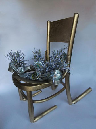 The work is made up of an old battered chair. I broke its legs and put it on its knees. I painted it gold and I put four shoes with their soles wide open above the chair's torn off seat to make it look like a mouth. Then I put two acacia thorns on each mouth to make them look like vampires' teeth.