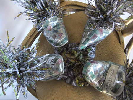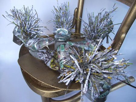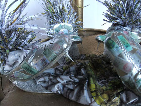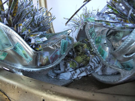 I painted the shoes silver and I covered them with small international banknotes that I had previously photographed and then printed. I placed them in a circle. In the centre I put their strange meal, our world, which resembles a shapeless mishmash that goes into their mouths and comes out completely destroyed. In fact, from the other side of the mouths (inside), hundreds of little strips showing the triturated Earth come out just like paper passing through a shredder.