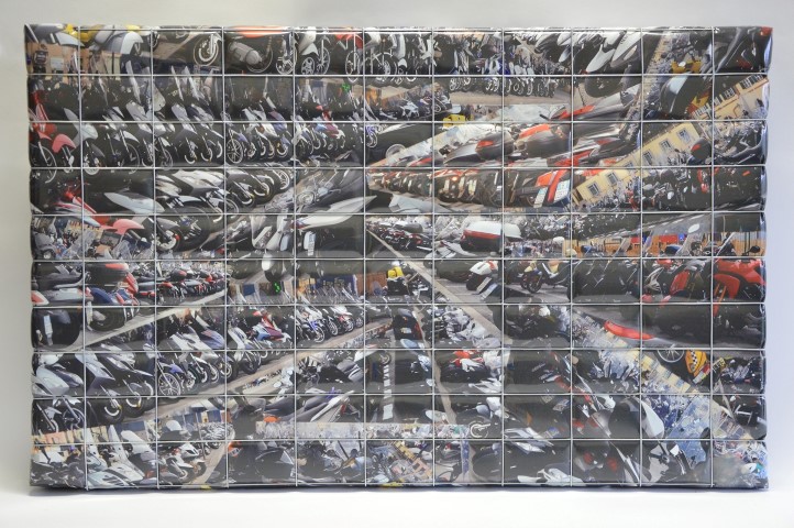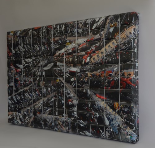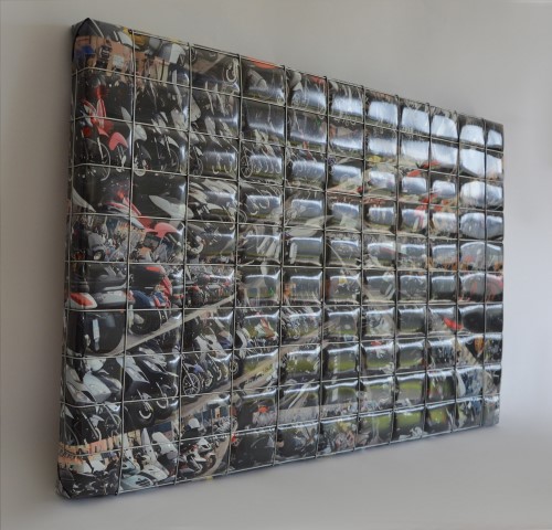 Gramsci Street is a collage with photos of motorbikes parked in this street of Genoa. Genoa is a city with few space. The streets are narrow and many people prefer to avoid the traffic moving on motorbike. This work belongs to the series "Imprisoned Brains" where the drawing is printed on a plastic sheet and put on a layer of foam rubber on the canvas with a net pressing the plastic sheet in front, thus creating a swelling of the underlying material.The grid is secured to the net with wire. The work is part of the series "Prison Brain" (detailed explanations in the works prior to 2016).