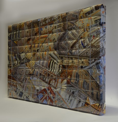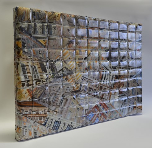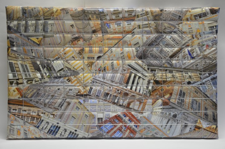 This work belongs to the series "Prison Brain" where the drawing is printed on a plastic sheet and put on a layer of foam rubber on the canvas with a net pressing the plastic sheet in front, thus creating a swelling of the underlying material. The grid is secured to the net with wire. The work is part of the series "Prison Brain" (detailed explanations in the works prior to 2016). In this work there are images of Genoa buildings whose story tells of the ancient prestige and splendor of the city hard to match and hence the title "The heavy Heritage."