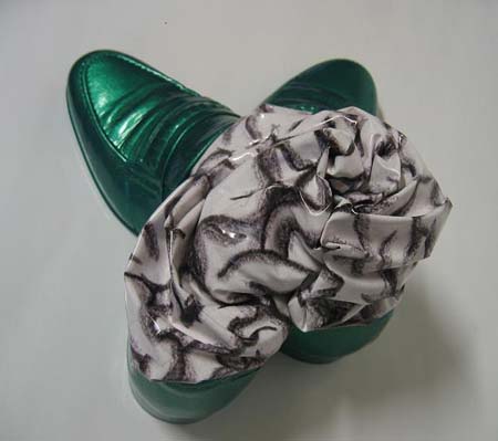 Sculpture made of concrete, shoes, printed plastic sheet, paint.