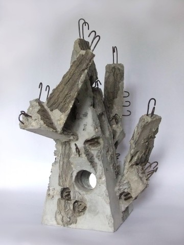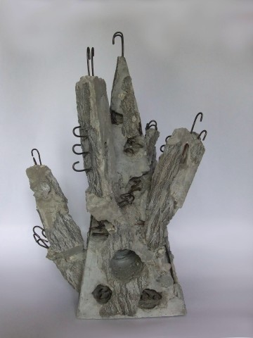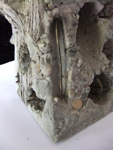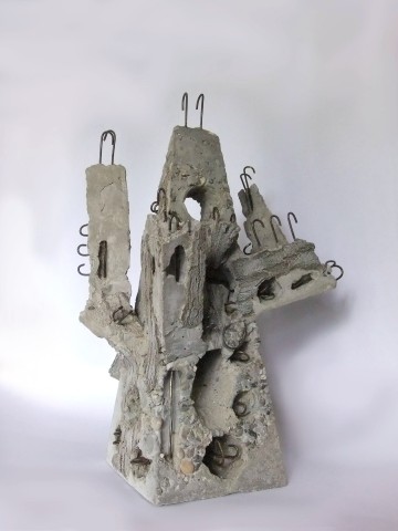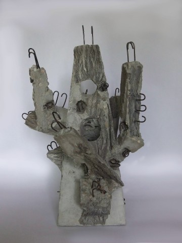 (Set of: Can man take the place of nature?) This sculpture reproduces a piece of tree, but it is not meant to be the true reproduction of a real tree, in effect the trunk and the branches are square. This absurd tree is made of concrete: it is easy to see and understand it is. It is a man-made manufacture and it has to be seen as such. It is a fake and it has to be seen as such. It is a ruined object. When we look at this piece of strange tree, it is as if we were already living in the future and watched a find of the past, the vestige of an age when man wanted to take the place of nature causing intolerable delusion. This work is entirely made of concrete and iron painted in varnish blotches. The iron structure is visible because of some cracks and holes in the concrete.