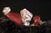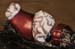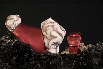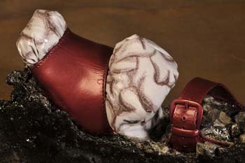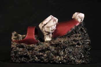 Sculpture made up of concrete, shoe, printed plastic sheet, artificial flower, paint.