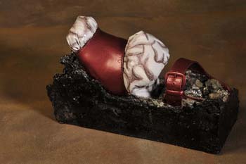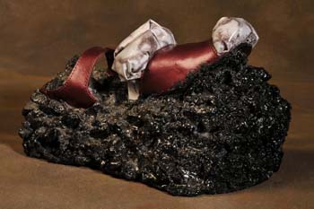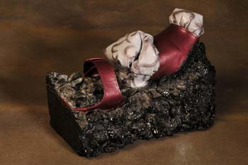 L’opera è fatta con un blocco di cemento e pietre da cui fuoriesce un sandalo contenente un cervello umano.