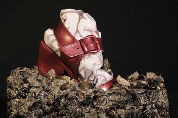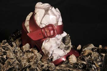 Sculpture made of concrete, stones, printed plastic sheet, sandal, paint.