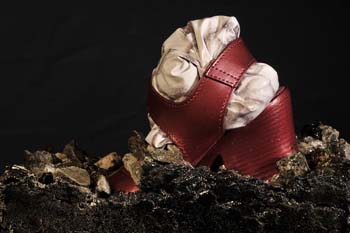 Scultura in cemento, pietre, foglio di plastica stampato, sandalo, vernice.