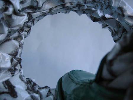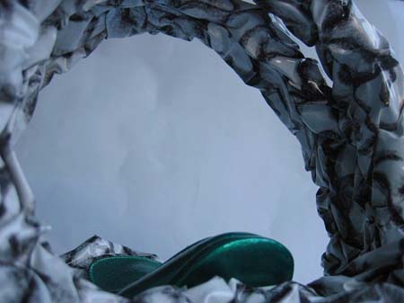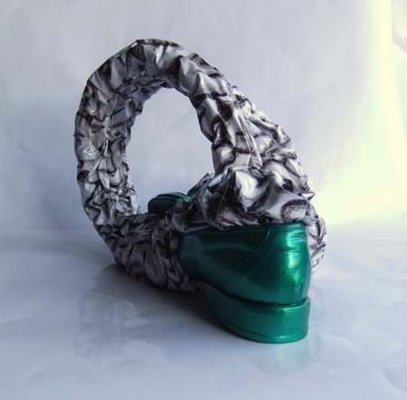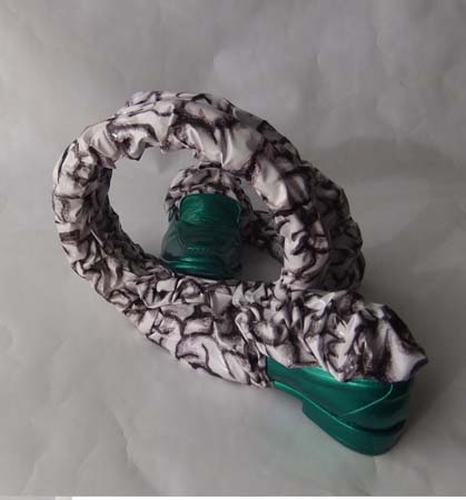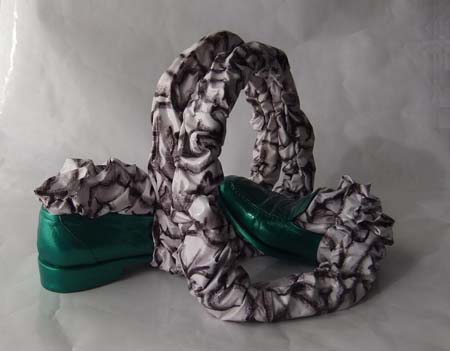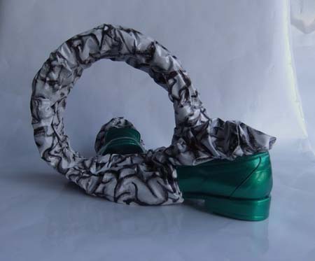 Scultura in cemento, scarpa, foglio di plastica stampato, vernice.