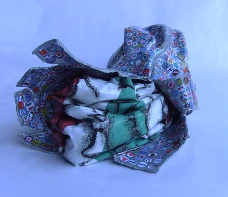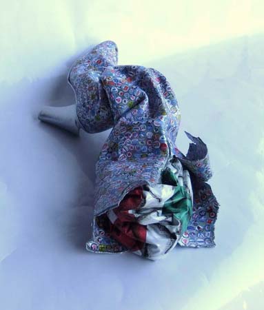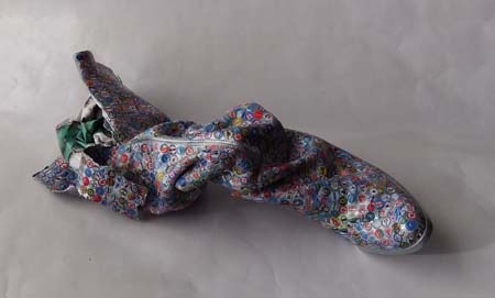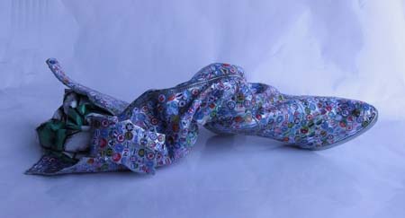 Sculpture made of concrete, shoe, printed plastic sheet, paper, paint.