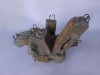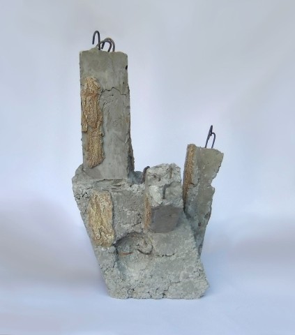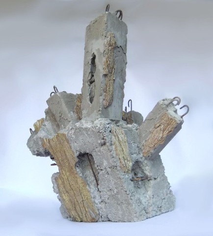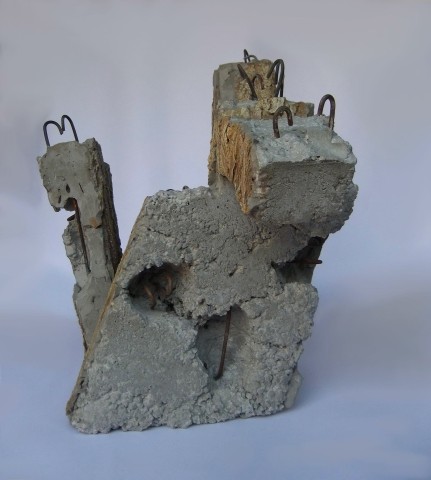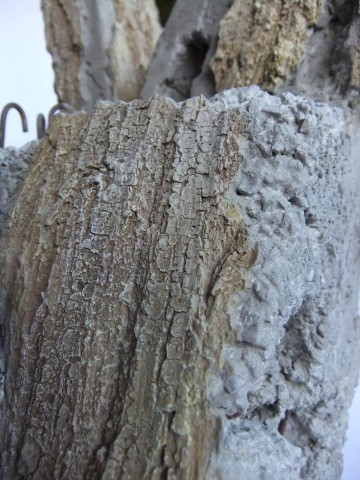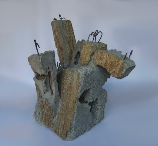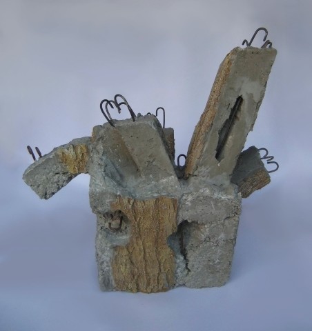 This sculpture reproduces a piece of tree, but it is not meant to be the true reproduction of a real tree, in effect the trunk and the branches are square. This absurd tree is made of concrete: it is easy to see and understand it is. It is a man-made manufacture and it has to be seen as such. It is a fake and it has to be seen as such. It is a ruined object. When we look at this piece of strange tree, it is as if we were already living in the future and watched a find of the past, the vestige of an age when man wanted to take the place of nature causing intolerable delusion. This work is entirely made of concrete and iron painted in varnish blotches. The iron structure is visible because of some cracks and holes in the concrete. Pieces of bark are still attached to the surface.