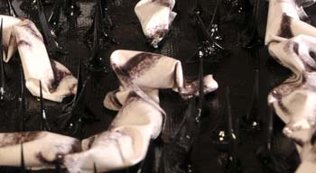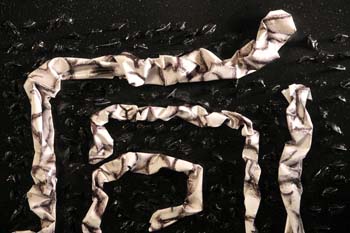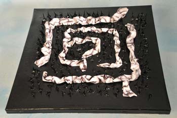 Sulla tela c’è un labirinto formato da spine di acacia. Nel labirinto ci sono piccoli “serpentelli” fatti con fogli di plastica su cui è stampato il disegno del cervello.