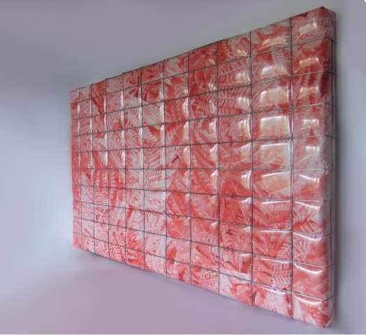 Scultura fatta con gommapiuma, griglia metallica, foglio di plastica stampato, vernice, tela, filo di ferro. Dimensioni: cm 80x50x3