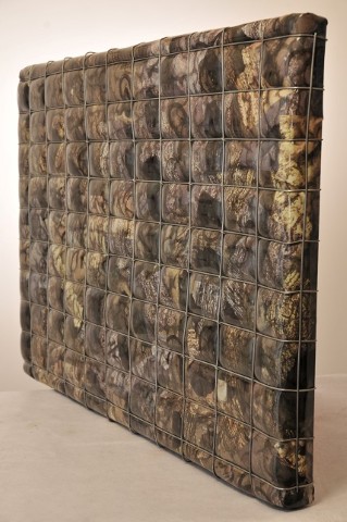 Scultura fatta con gommapiuma, griglia metallica, foglio di plastica stampato, vernice, tela, filo di ferro. Dimensioni: cm 80x50x3
