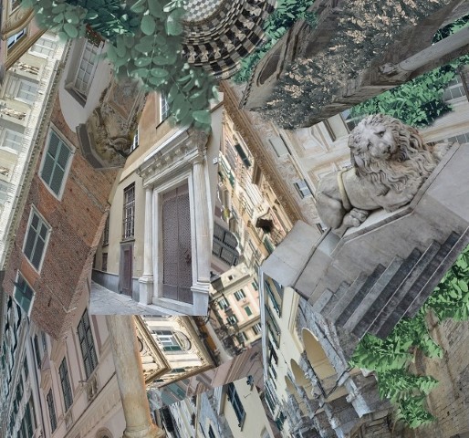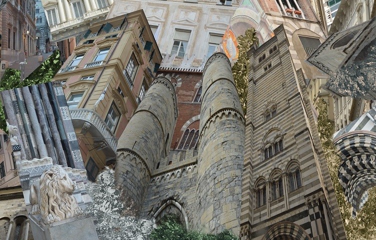 San Lorenzo n.1 is a collage with photos of the facades of buildings located in the San Lorenzo area of Genoa, in the heart of the city. It includes historic buildings and the Cathedral. Area without vegetation which is inserted as an abstraction in the work. The photos are printed on a plastic sheet, placed on the canvas. The work is part of the "Free" series which in turn derives from the "Prison" series.