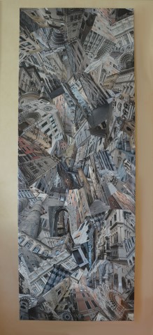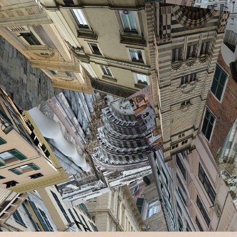 San Lorenzo n.2 is a collage with photos of the facades of buildings located in the San Lorenzo area of Genoa, in the heart of the city. It includes historic buildings and the Cathedral. Area without vegetation which is inserted as an abstraction in the work. The photos are printed on a plastic sheet, placed on the canvas. The work is part of the "Free" series which in turn derives from the "Prison" series.