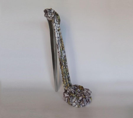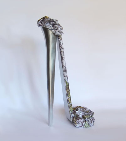 The work is made up of a very high shoe heel, a very long sole and a poor world rolling down.