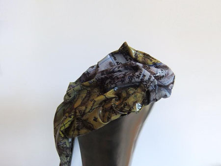 Scultura in cemento, scarpa, foglio di plastica stampato, vernice.