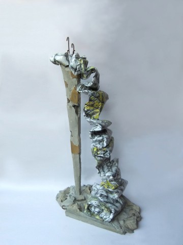 The work is made up of a very high shoe heel, and a poor world rolling down. The heel, that simulate a tower, is made of raw concrete. It is ruined, as an old destroyed building, in fact you can see the iron of its skeleton, crakes and holes. On his surface there are some pieces of smooth gold plaster, witnesses of an old and lost glory. The world is made of concrete and a plastic sheet where I printed the drawing of the brain as a basis where I put the drawing of the world map. The pedestal is part of the sculpture. It is made with raw concrete where pieces of destroyed buildings are emerging.