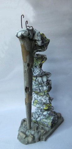 Il piedistallo è parte della scultura. E’ fatto in cemento grezzo da cui emergono pezzi di edifici distrutti.