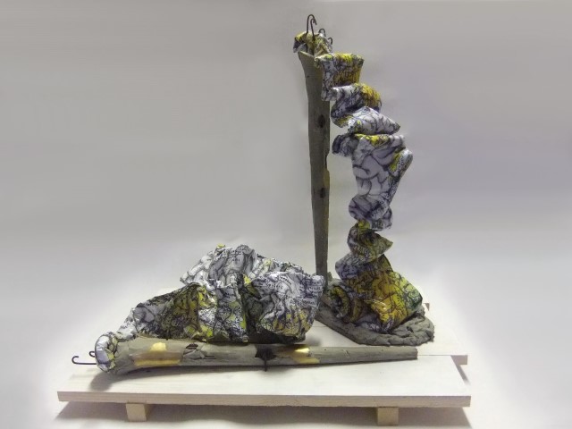 Sculpture made of concrete, shoe, printed plastic sheet, paint.