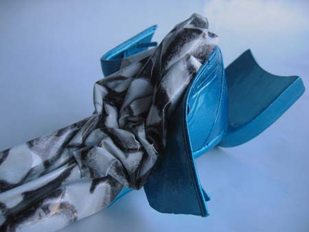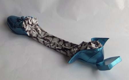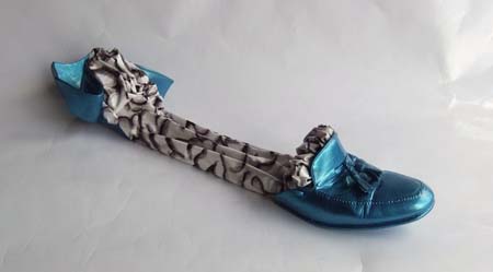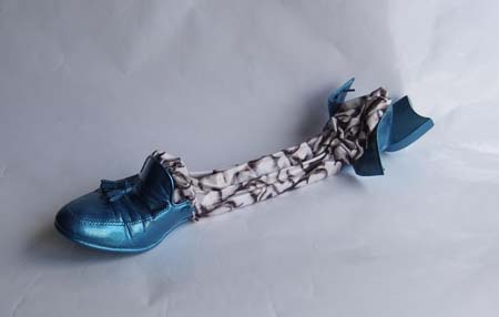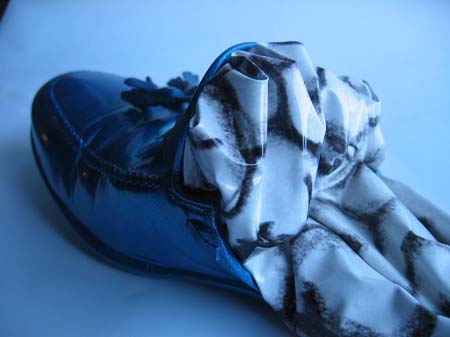 Scultura in cemento, scarpa, foglio di plastica stampato, vernice.