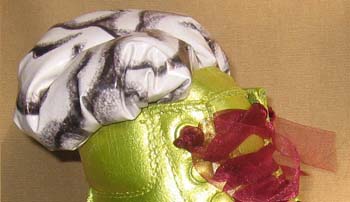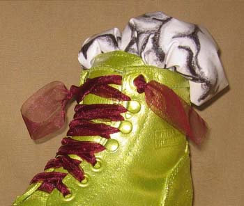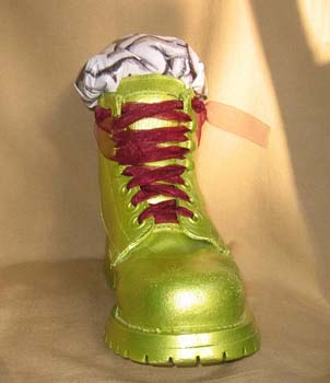 Sculpture made of concrete, printed plastic sheet, little boots, ribbons, paint.